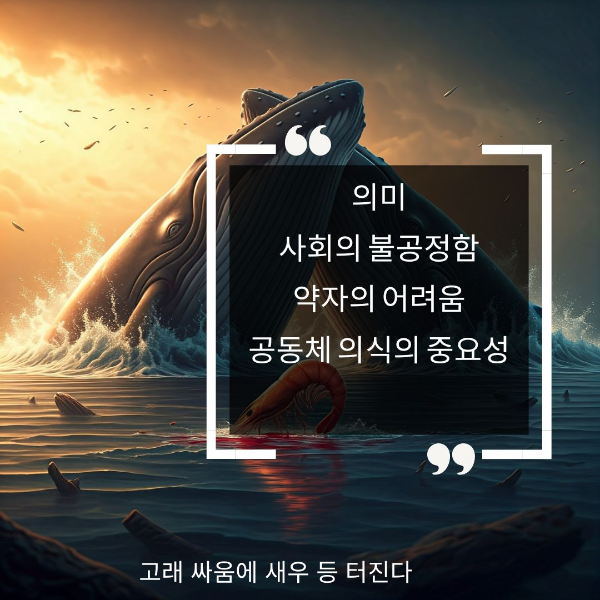 "고래 싸움에 새우 등 터진다"라는 속담은 오랜 시간 동안 우리 사회가 안고 있는 문제점을 명확하게 보여주고 있습니다. 이 속담을 통해 우리는 사회의 불공정함에 대해 다시 한번 생각해 보고, 더 나은 세상을 만들기 위해 노력해야 할 것입니다.