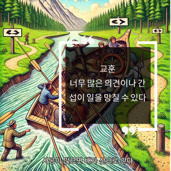 "사공이 많으면 배가 산으로 간다"는 너무 많은 의견이나 간섭이 일을 망칠 수 있다는 경고를 담고 있어요. 특히, 공동 작업에서는 역할 분담과 조화가 필수랍니다!