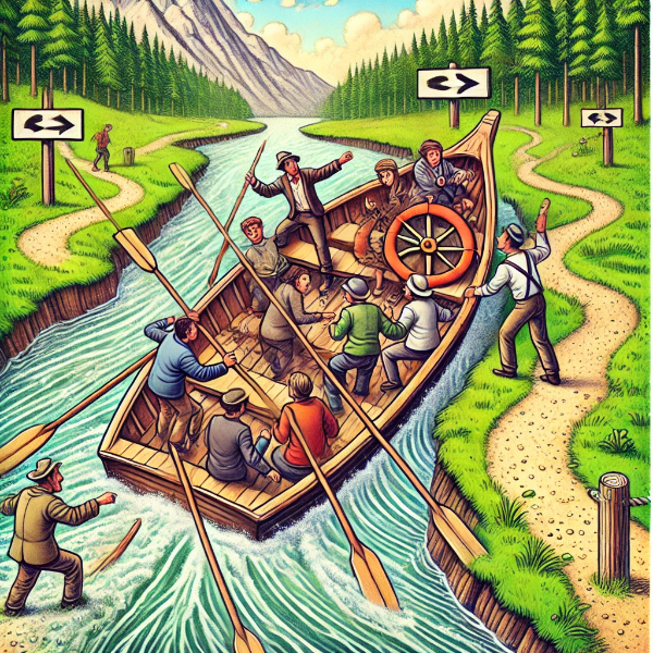 이 속담은 너무 많은 사람이 간섭하거나 의견을 내면, 일이 엉뚱한 방향으로 진행된다는 뜻입니다. 한 방향으로 나아가기 위해서는 리더십과 협력이 중요하다는 교훈을 담고 있어요.